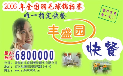 2006全國(guó)羽毛球比賽在鹽城市新體育館舉行。豐盛園快餐公司又一次從眾多的競(jìng)爭(zhēng)對(duì)手中勝出,成為本次活動(dòng)的唯一指定專用快餐。